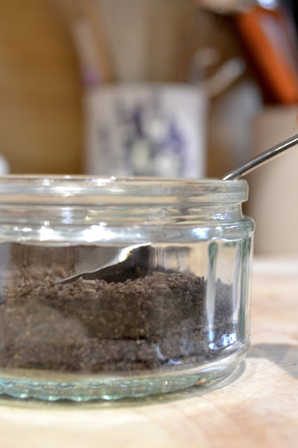 Step 3) Using a teaspoon, line the bottom of your pots with the Oreo mixture (approx 4 teaspoons worth) and compress it.