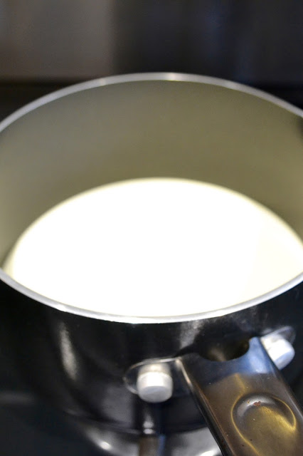 Step 4) Warm the cream in a saucepan until it just bubbles.